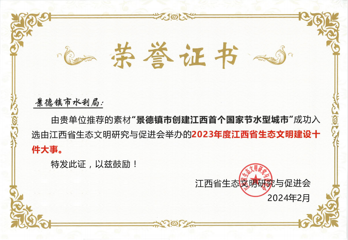 近日,江西省生态文明研究与促进会向我局发来荣誉证书,由我局推荐的素材“景德镇市创建江西首个国家节水型城市”成功入选2023年度江西省生态文明建设十件大事。